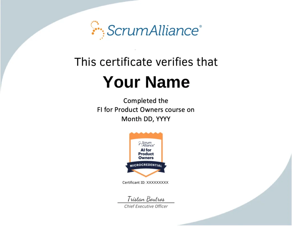 “AI for Product Owners” is a Scrum Alliance micro credential certification course taught by Certified Scrum Trainers. It is designed to help Product Development and Management people to learn how to use AI in their day to day work and improve their Product management practices powered by AI tools.
